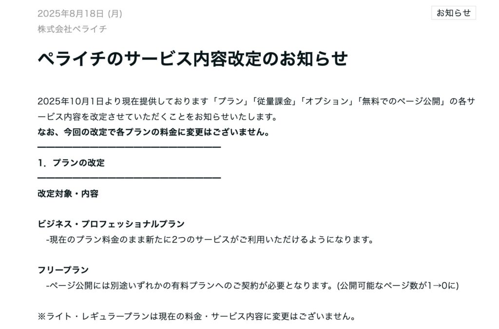 ペライチ公式サイトよりスクショしました。 はじめに ホームページ作成サービス「ペライチ」で、大きな変更が発表されました。これまで「フリープラン」で1ページだけ無料公開できていましたが、2025年10月1日からは公開ができなくなることが発表されまし... -